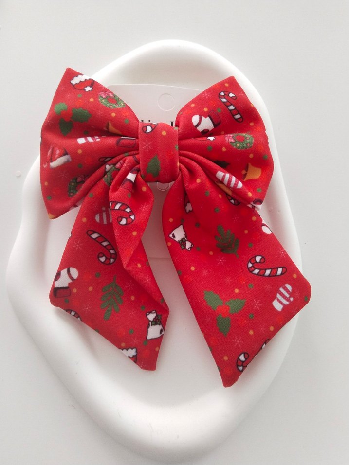Sentetik kumaştan yapılmış, renkli ve kırmızı fiyonk şeklinde saç aksesuarı, sıcak ve pop kültür tarzı detaylar içerir.