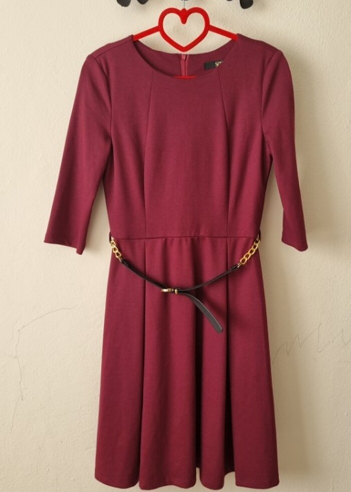 38 beden triko zincir kemerli elbise. İki kol altı arası 41 cm'dir. Boyu omuzdan 93 cm'dir. Sorunsuzdur. Bordo renk.