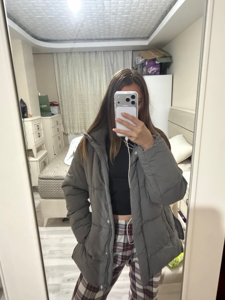 Gri renkte, bol kesim kadın kışlık mont, yüksek yakalı ve uzun kolludur. Midi boyda, yumuşak ve sıcak kumaştan kapitone tasarıma sahiptir, rahat sokak stiline uygundur. Şapkası takılıp çıkarılabiliyor ❄️