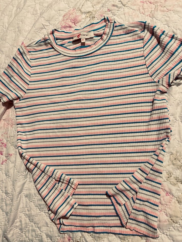 Kısa kollu, bisiklet yakalı, pamuklu triko kumaştan yapılmış, pastel çok renkli çizgili, bohem tarzda kız çocuk tişörtü. Sadece bir kere kullanıldı XS bedendir çok şıktır. Kusursuzdur. Fotoğrafta göründüğünden daha güzeldir. Kumaşın yakın görüntüsü 3. fotoğraftaki gibidir. Sim görünümlüdür.