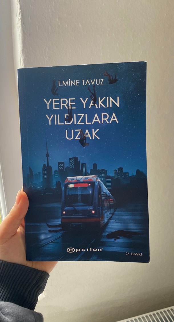 Emine Tavuz'un "Yere Yakın Yıldızlara Uzak" adlı romanı, Opsilon tarafından 28. baskısı yapılmış. Kapakta şehir manzarası ve tramvay yer alıyor.