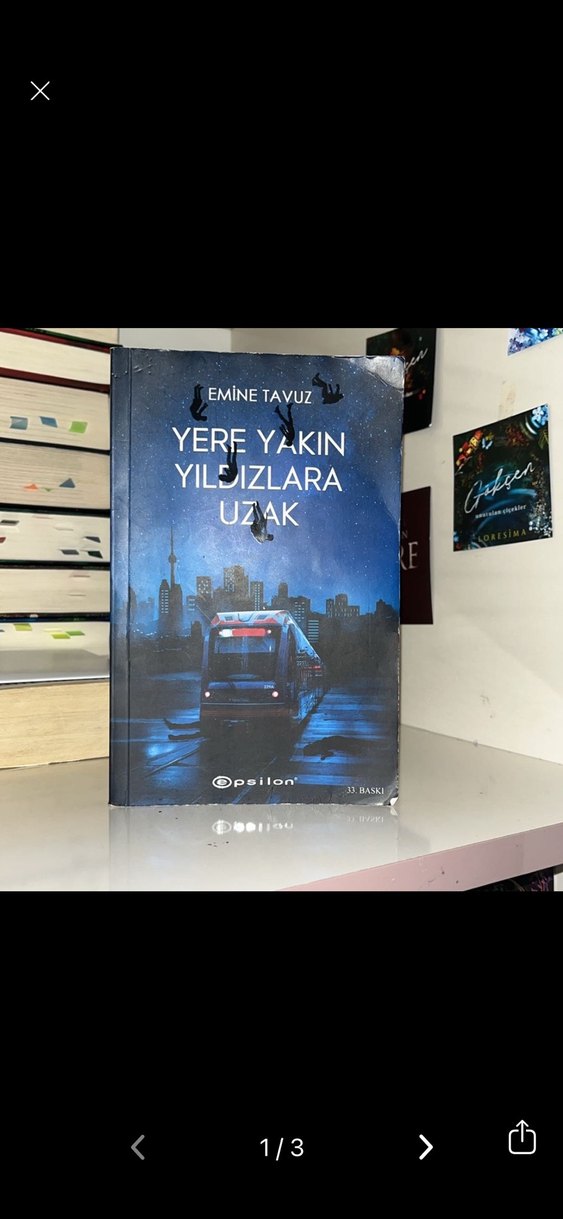 Emine Tavuz'un 'Yere Yakın Yıldızlara Uzak' adlı romanı, kapakta gece şehir manzarası ve tramvay bulunuyor.