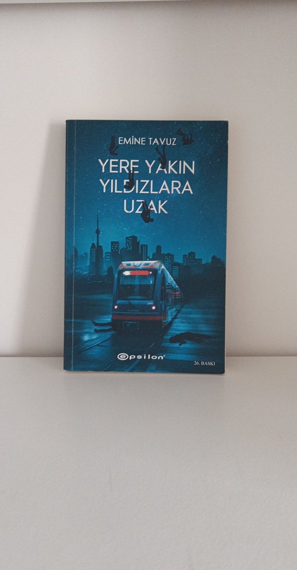 Emine Tavuz'un 'Yere Yakın Yıldızlara Uzak' adlı romanı, gece şehir manzarası ve tramvay görseliyle. Epsilon yayınevi, 2. baskı.