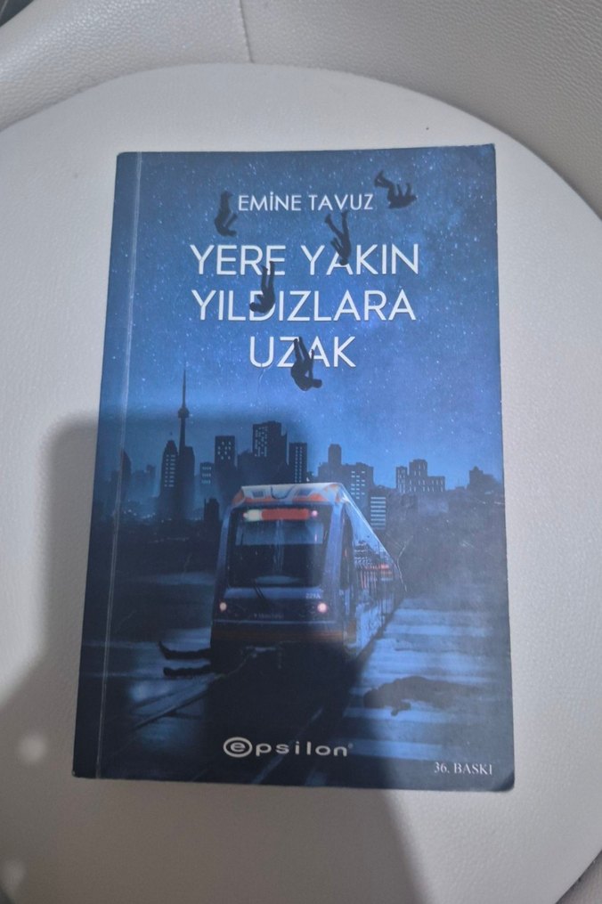 Emine Tavuz'un 'Yere Yakın Yıldızlara Uzak' adlı romanı, kapakta şehir manzarası ve tren görseliyle Epsilon yayınevinden.