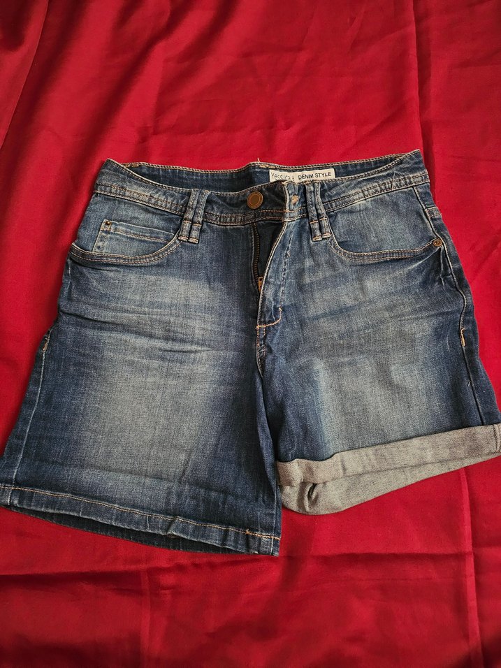 Kadınlar için , kısa boy, katlanmış paçalı denim mini şort. Gri-mavi renk ve sade tasarım günlük kullanımda zahmetsiz şıklık sunar. İYİ durumda, hasarsiz.