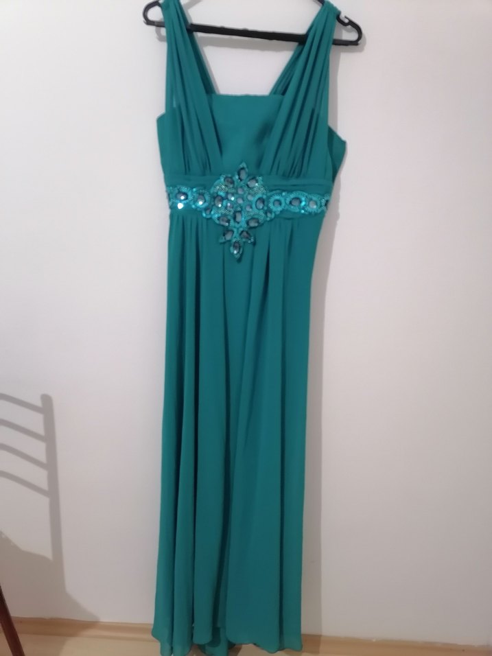 Yeşil renkli, straplez yakalı ve drapeli uzun abiye elbise. Bel kısmında parlak işlemeler ve vücuda oturan kesim bulunur. Düğünler için uygundur.