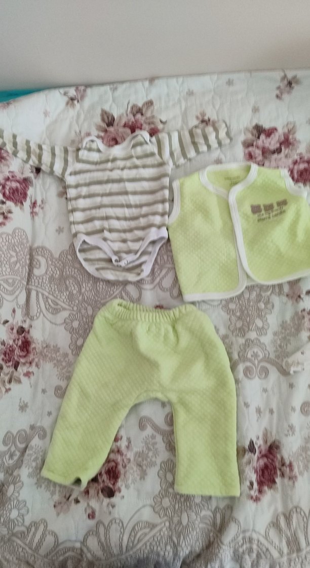 Bu bebek 3'lü takım, yelek, pantolon ve uzun kollu çizgili body'den oluşur. Takım, yumuşak pastel yeşil tonlardadır. 6-9 ay kullanım için rahattır.