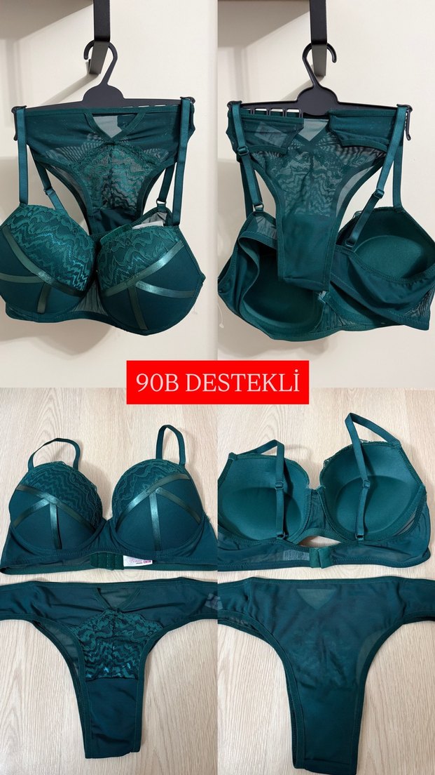 Sıfır etiketli ürün. Turkuaz renkte, modern klasik tarzda, 90B destekli sütyen ve uyumlu alt parçadan oluşan takım. Ayarlanabilir askılı ve desensiz kumaşlıdır.
