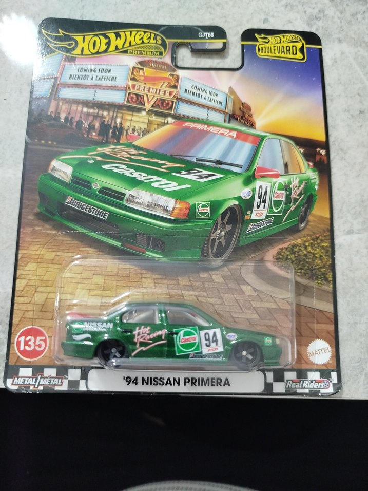'94 Nissan Primera model yeşil oyuncak araba, yarış numarası 94 ve sponsor logoları ile detaylandırılmıştır. Hot Wheels Boulevard serisinden.