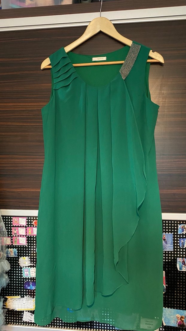 V yaka, kolsuz yeşil abiye elbise, taş detaylı ve parlak kumaşlıdır. 1 kere giyildi . Ne kısa ne uzun bir elbise boyunuza göre diz hizasında durur muhtemelen