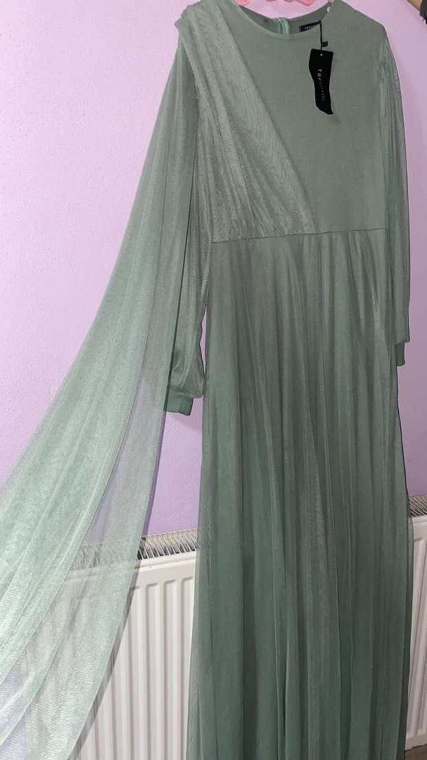 Uzun kollu, bol kesim omuzdan pelerinli su yeşili renkli abiye elbise. düğünler için uygun.