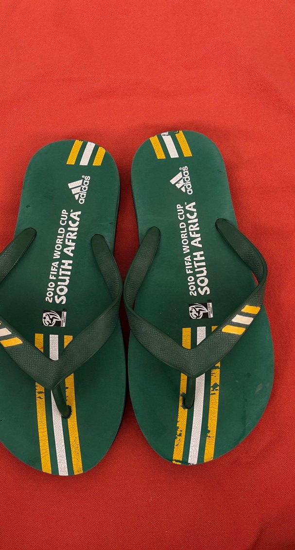 2010 FIFA Dünya Kupası Güney Afrika temalı, renkli baskılı çizgili, cırt cırtlı yeşil Adidas erkek terliği. Spor ve rahat kullanım için uygundur.