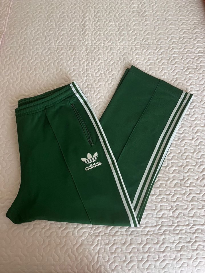 Fermuarlı cepleri ve beyaz yan çizgileri olan, sentetik kumaştan yapılmış, yeşil Adidas erkek eşofman altı. Spor ve gündelik kullanıma uygundur.