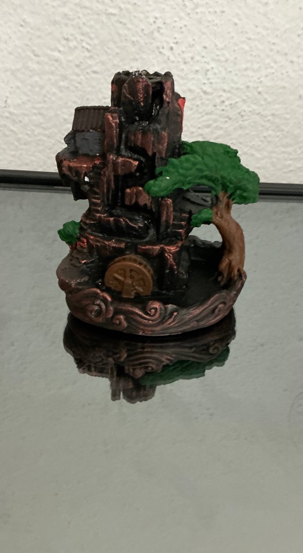 Bu koyu renkli tütsülük, yeşil ağaç ve detaylı dokulara sahip kayalık yapıyla doğal ve sanatsal bir görünüm sunar.