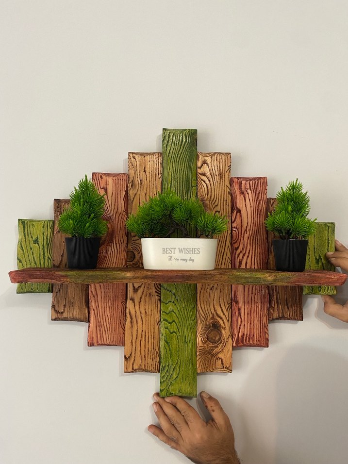 Yeşil Ahşap Duvar Rafı ve Saksı Seti