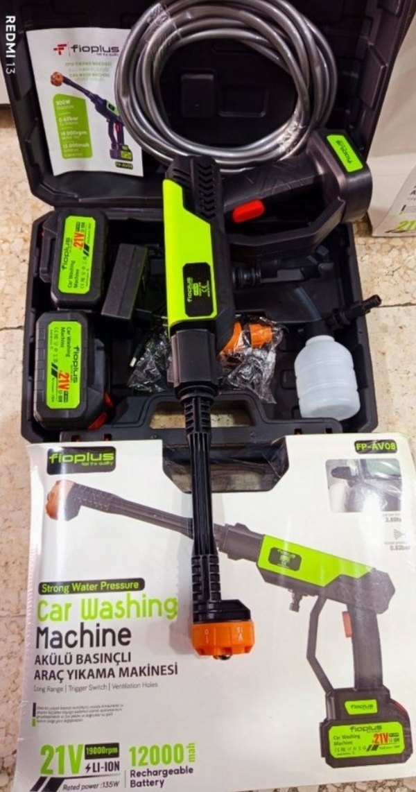 Yeşil renkli, akülü basınçlı araç yıkama makinesi, güçlü su basıncı, iki batarya ve sprey tabancası ile birlikte gelir. Taşınabilir ve etkili araç temizliği sağlar.