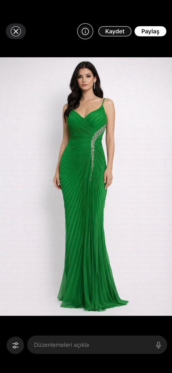 Nişantaşı Setre mağazasından alındı son fiyattır. Sadece bir kez düğünde giyildi etiketi ile birlikte duruyor Yeşil parlak renkte, pilili ve desenli, straplez uzun abiye elbise. Kolsuz ve klasik şıklıkta, düğün için uygun, vücuda oturan kesim….