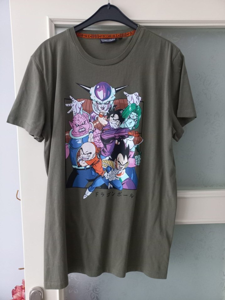Yeşil pamuk tişört, kısa kollu ve yuvarlak yaka. Önünde renkli anime baskısı vardır, rahat kesimdir. Unisex kullanıma uygun