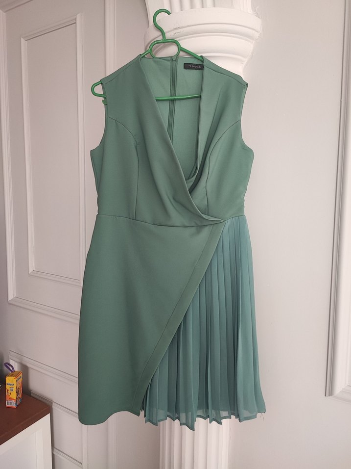 Pastel yeşili, v yakalı ve asimetrik pilili etek detayına sahip.