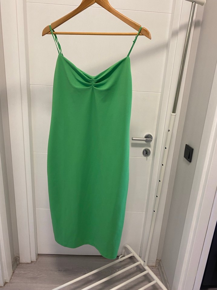 Bu yeşil, askılı midi elbise, drapeli straplez yaka ve ince askılarla, şık sokak modası için uygundur.
