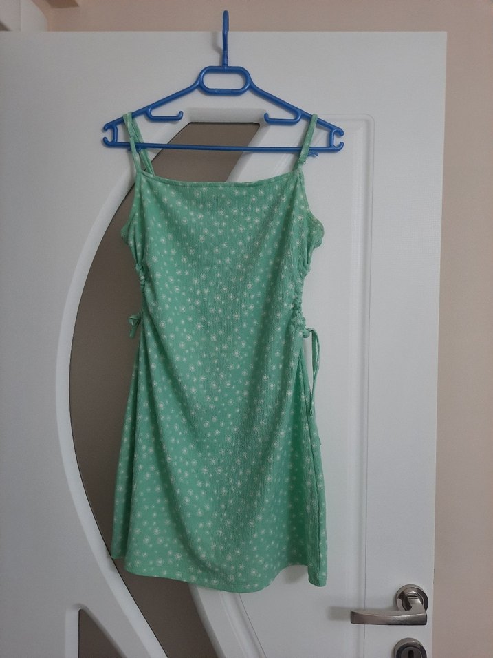 Yeşil pastel tonlarda, askılı ve straplez yakalı, rahat kesim. Mavi marka. M beden.