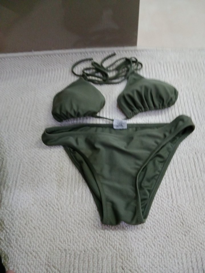 Yeşil askılı, vücuda oturan kadın bikini. Desensiz ve sade bohem tarzıyla plaj için uygun. Rahat ve şık bir seçim.
