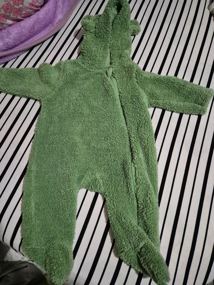Yeşil renkli, örgü dokulu bebek tulumu, kapüşonlu ve tam kapalıdır. Yumuşak ve sıcak kumaştan yapılmıştır, desensiz ve sade bir tarza sahiptir. ❄️