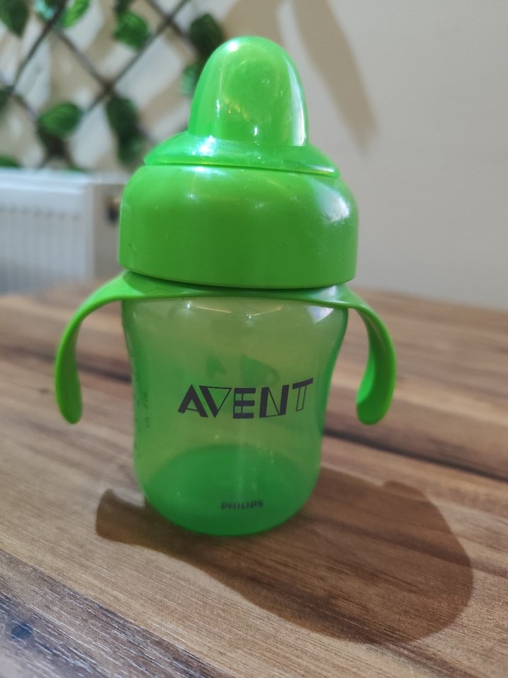 Yeşil renkli Avent bebek biberonu, kolay tutuş için kulplu ve koruyucu kapaklıdır. Rahat besleme sağlar.