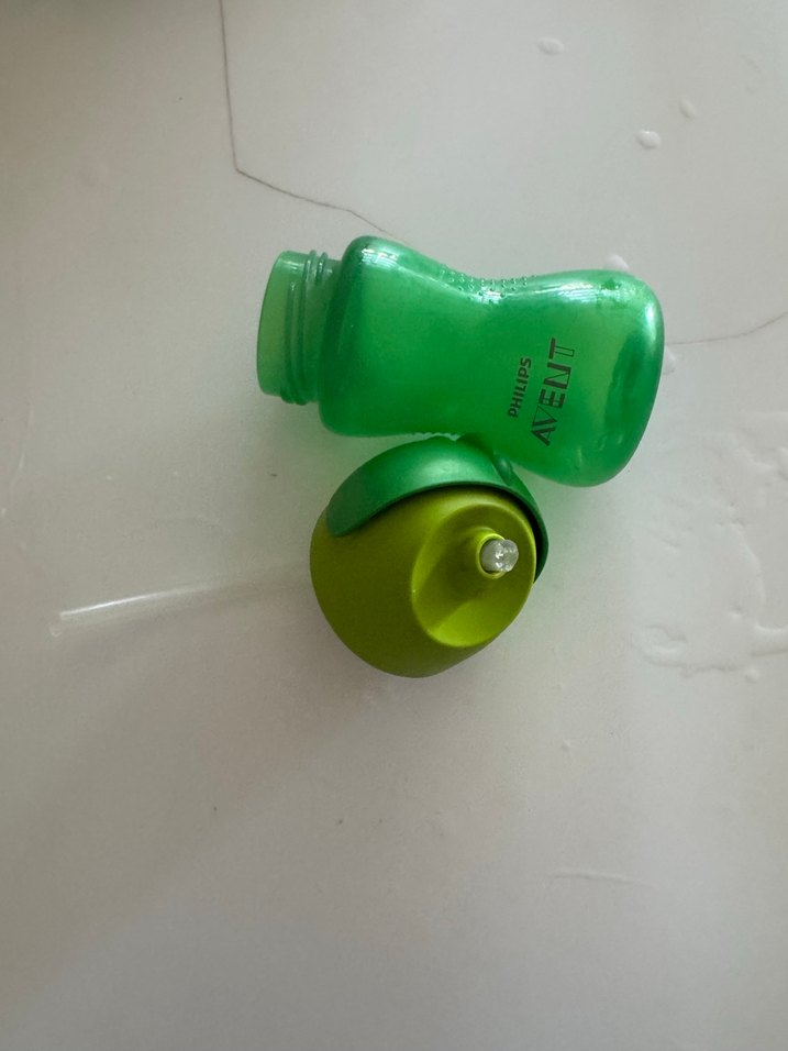 Renkli yeşil Avent bebek suluk rahat şekilli ve yumuşak, dinozor temalı, pipet ucu fotoda görüldüğü gibi ısırılmış olduğu için deforme