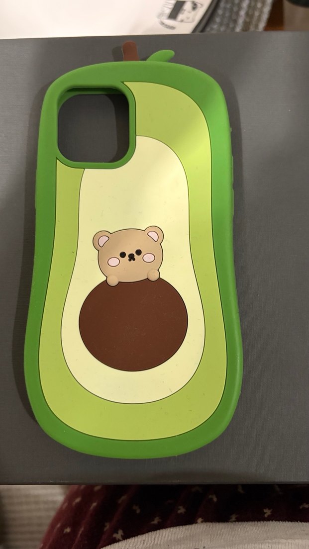 Pastel yeşil renkte, tokalı ve pop kültür tarzında avokado ve sevimli ayı desenli telefon kılıfı.