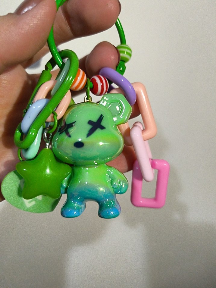 Yeşil ayıcık figürü ve pastel renkli plastik halkalarla detaylandırılmış, renkli zincirli anahtarlık. Punk rock ve avant-garde tarzında.