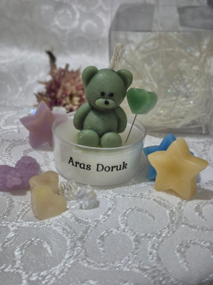Fitilli, pastel yeşil ayıcık figürlü mum ve küçük pastel yıldız şeklinde mum süslemeleri. 'Aras Doruk' 50 ve üzeri alımlarda 22 ₺