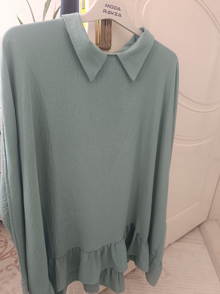 Yeşil ayrobin tunik, yakalı ve uzun kollu, alt kısmında fırfır detaylı rahat kesim. Desensiz ve pastel tonlarda.