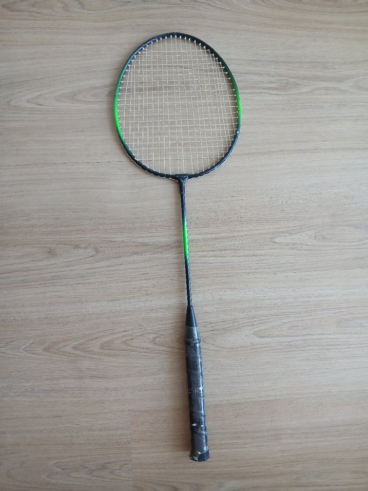 yeşil badminton raketi, rahat tutuş ve standart tel dizilimine sahiptir.