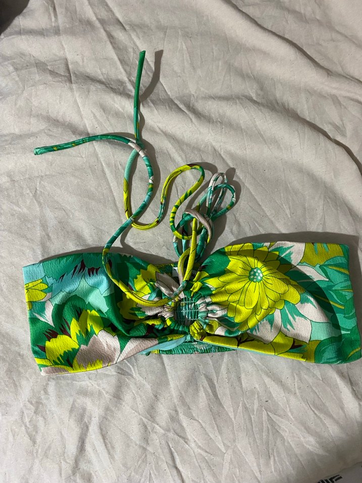 Renkli yeşil tie-dye çiçek desenli, bağcıklı ve elastik destekli, bohem tarzda uzun kesim bikini üstü.