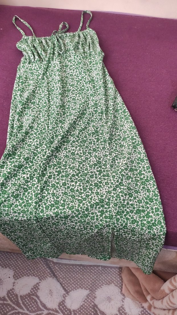 Yeşil Bağcıklı elbise diz altına iniyor boyu
