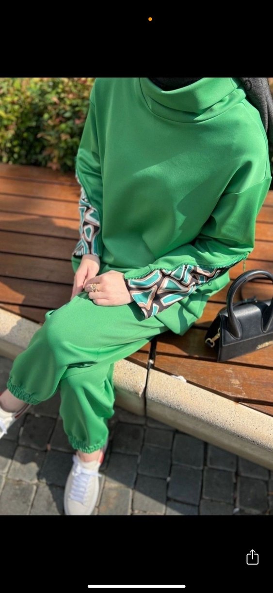 Kadınlar için oversize kesim, uzun kollu ve balıkçı yaka eşofman takımı. Yumuşak sentetik kumaştan, pastel yeşil tie-dye desenli ve kollarda zincir detaylıdır, günlük rahat kullanım için uygundur.