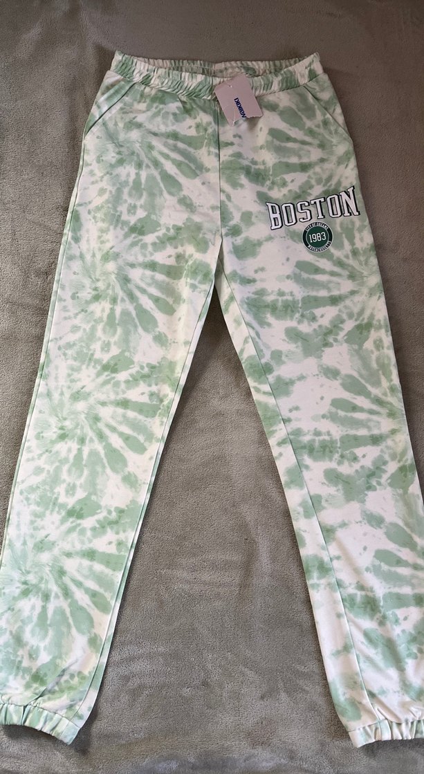 Pamuklu, pastel yeşil tie-dye desenli, düğmeli ve "BOSTON" baskılı, bol kesim uzun kız çocuğu eşofmanı. Spor ve günlük kullanım için uygun. ♀️