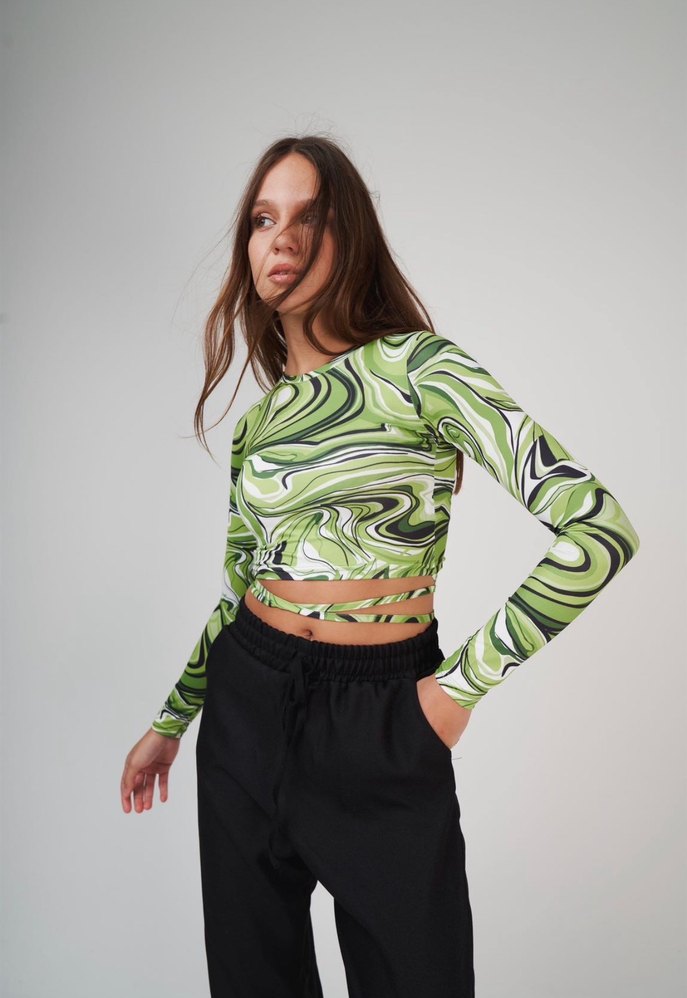 Uzun kollu, yuvarlak yaka ve açık yeşil bağcıklı desenli, elastik sentetik kumaştan yapılmış, kısa kesim ve bağcıklı kadın bluzudur. Trendy rahat tarz için uygundur.