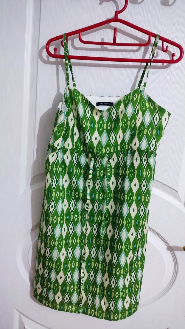 Askılı, yeşil bağlama desenli ve bohem tarzda elbise . Günlük kullanıma uygun, vücuda oturan bel detaylı kesime sahip.