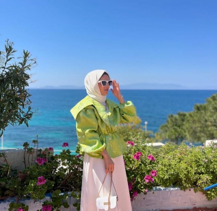 Yüksek yakalı ve uzun kollu, bol kesim midi çekettir. Sentetik kumaştan yapılmış, pastel yeşil renkte, günlük kullanıma uygundur.