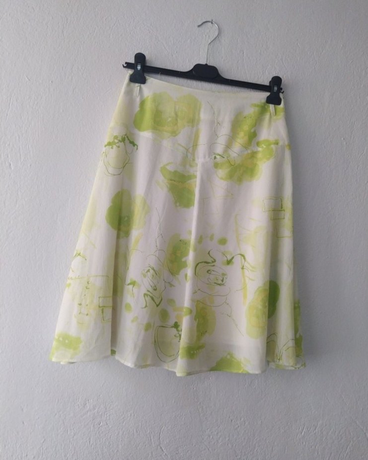 Yumuşak keten kumaştan, pastel yeşil bağlama desenli, bol kesim kısa hamile eteği, günlük kullanım için uygun.