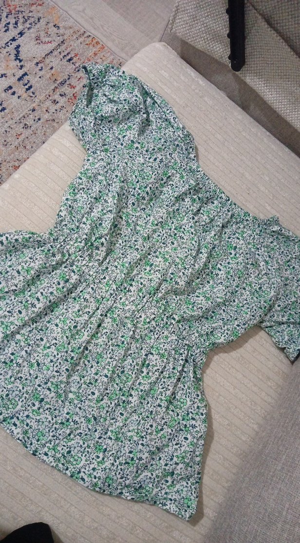 Bu bol kesim hamile bluzu kısa kollu, tekne yaka ve düğmeli öne sahiptir. Kısa boyda ve pastel yeşil bağlama desenlidir, bohem tarzı yansıtır.