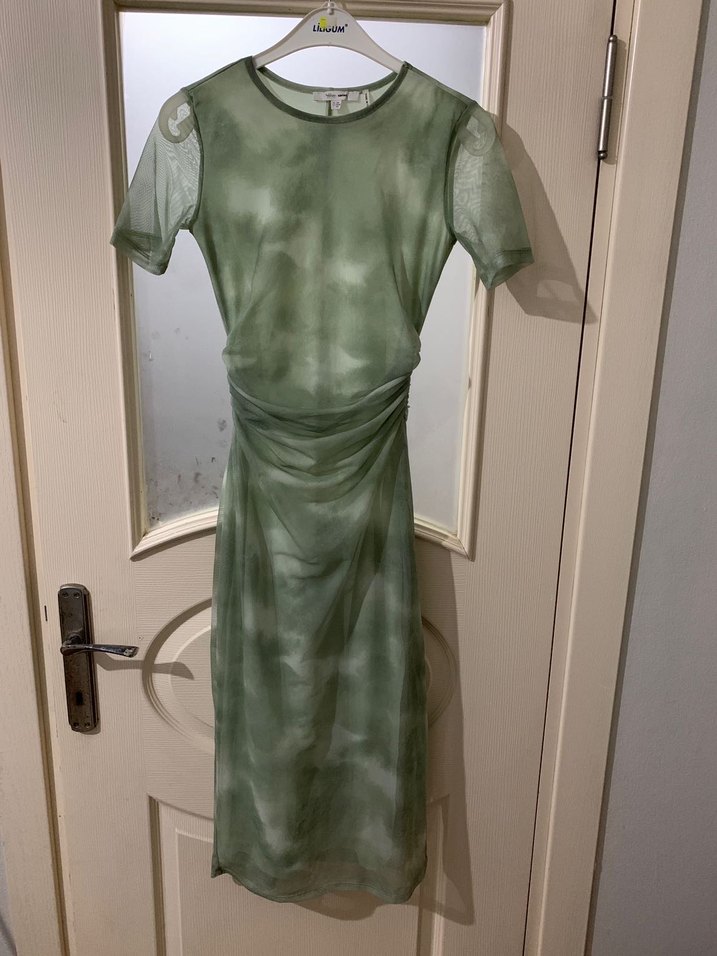 Yeşil bağlama desenli uzun elbise, kısa kollu ve yuvarlak yakalıdır. Yumuşak sentetik kumaştan, bohem tarzda ve günlük kullanıma uygundur.