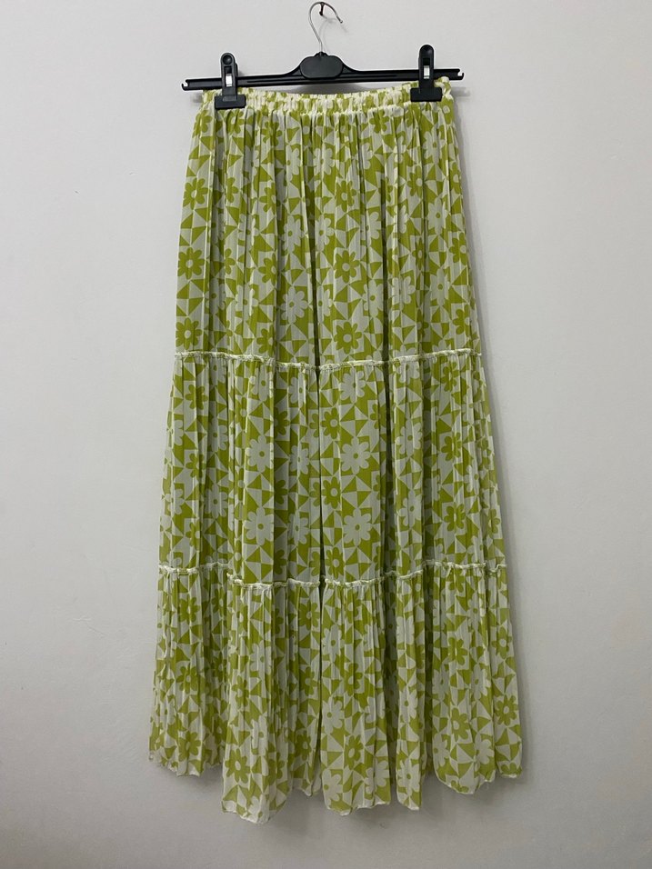 Yeşil Bağlama Desenli Pilili Uzun Etek