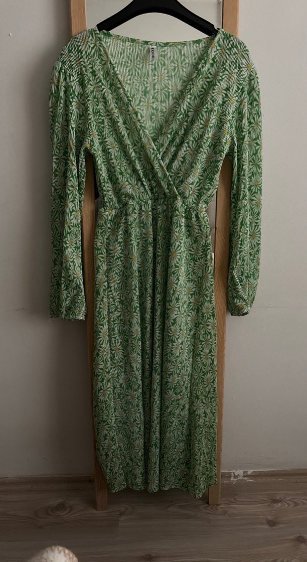 Yeşil bağlama desenli uzun elbise, bol kesim ve drapeli tasarıma sahiptir. Uzun kollu, V yakalı ve yumuşak sentetik kumaştan yapılmıştır.