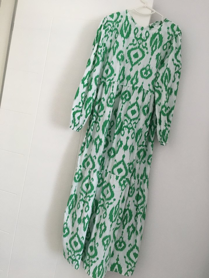 Sentetik kumaştan yapılmış, uzun ve bol kesim yeşil bağlama desenli elbise, pile detaylı ve uzun kolludur, tekne yaka bohem tarzını yansıtır.