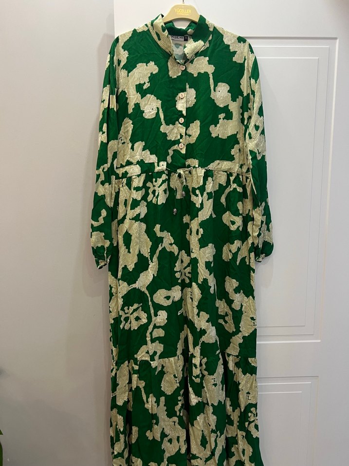 Koyu yeşil bağlama desenli uzun elbise, bol kesim ve uzun kolludur. Yüksek yakalı ve düğmeli, yumuşak viskon kumaştan yapılmıştır.