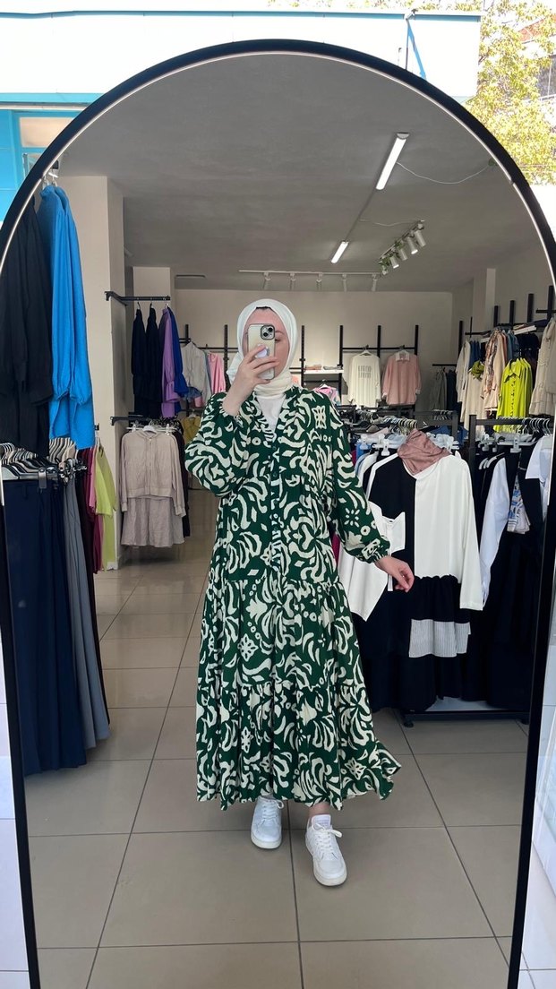Yeşil bağlama desenli, uzun ve salaş kesim elbise. Sentetik kumaştan, uzun kollu ve drapeli tasarıma sahip, bohem ve modest tarz için uygun. 1 adet standart beden boy 130 cm kol 64 cm göğüs 96 cm