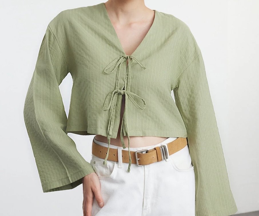 V yaka ve önünde iki bağcık bulunan, keten kumaştan yapılmış, bol kesim kısa uzunlukta bluz. Pastel bej tonunda, günlük sokak stili için uygun.